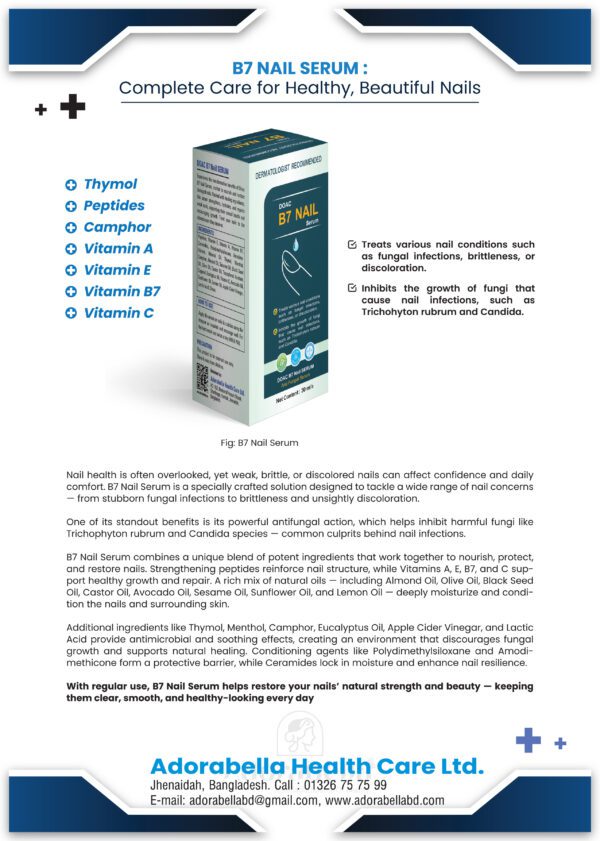 B7 Nail Serum is a dermatologist-recommended formula enriched with Thymol, Camphor, and Eugenol to treat brittle, discolored, or fungal-infected nails. Infused with natural oils and vitamins, it hydrates, repairs, and strengthens nails while protecting against infections. Suitable for all skin types and ideal for daily nail care.